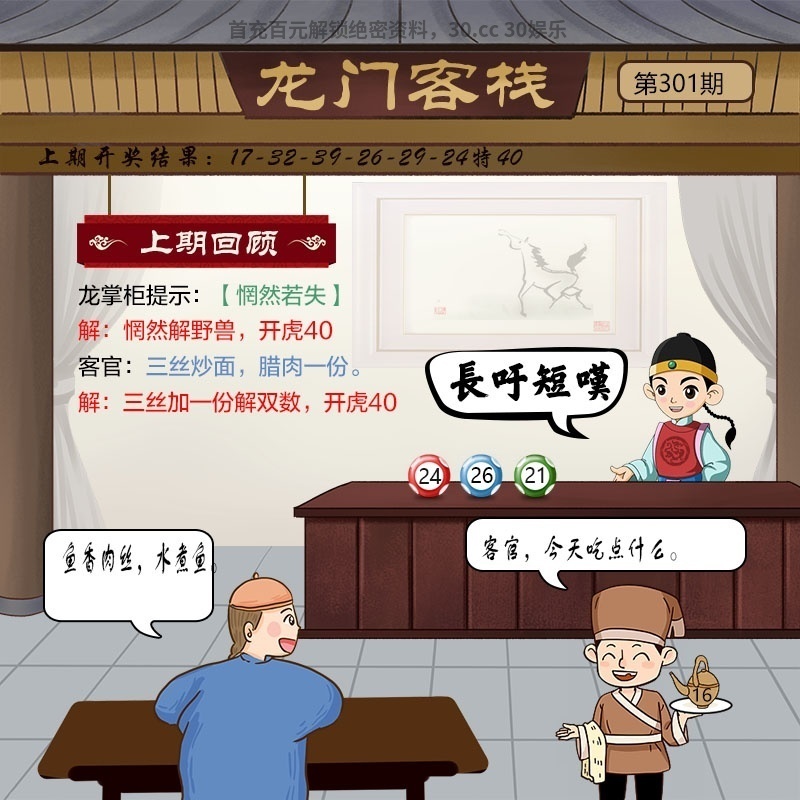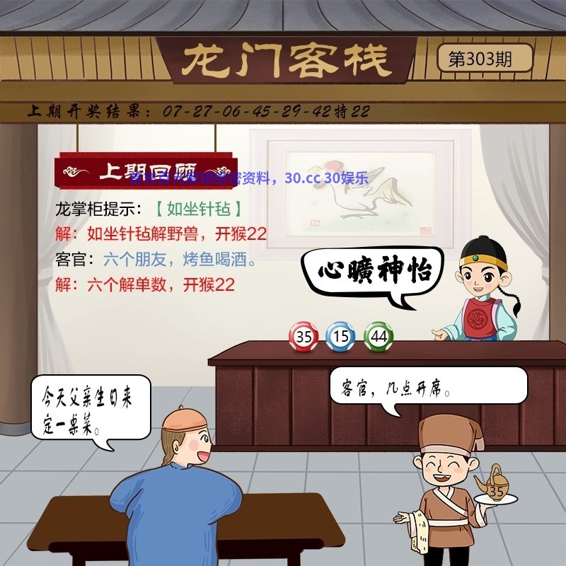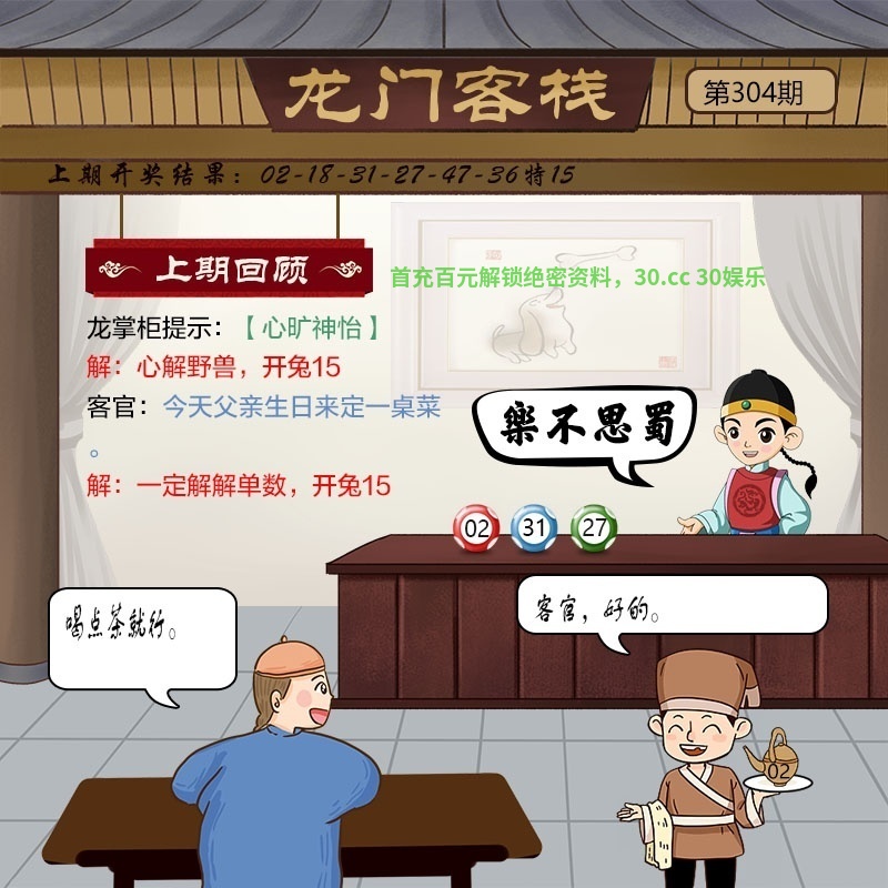 305期:龙门客栈解析 掌柜:早春时节 小二:客官,收到 客官:有点味道的酸菜 解:早春时节。解鼠狗猪虎猴鸡 推荐特肖:鼠狗猪虎猴鸡 |